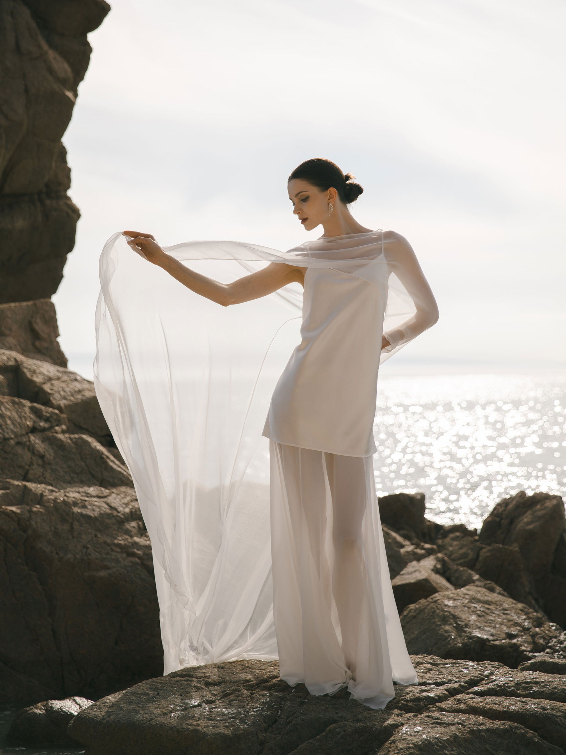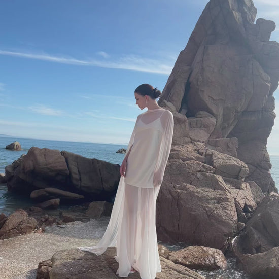 This bridal cape is made from 100% silk, so it feels incredibly soft and flows beautifully. It’s sheer, delicate, and has that luxurious look without feeling too heavy. If you’re a modest bride who still wants something light and elegant, this cape is honestly perfect.