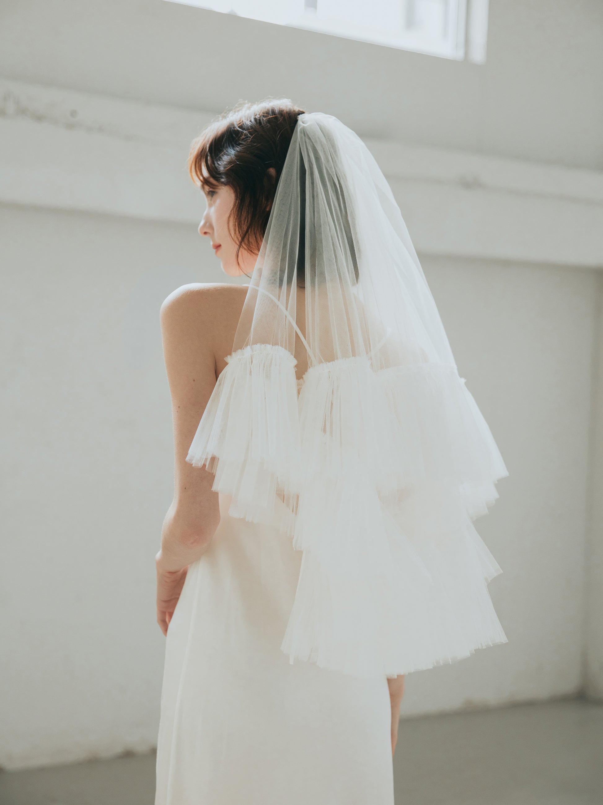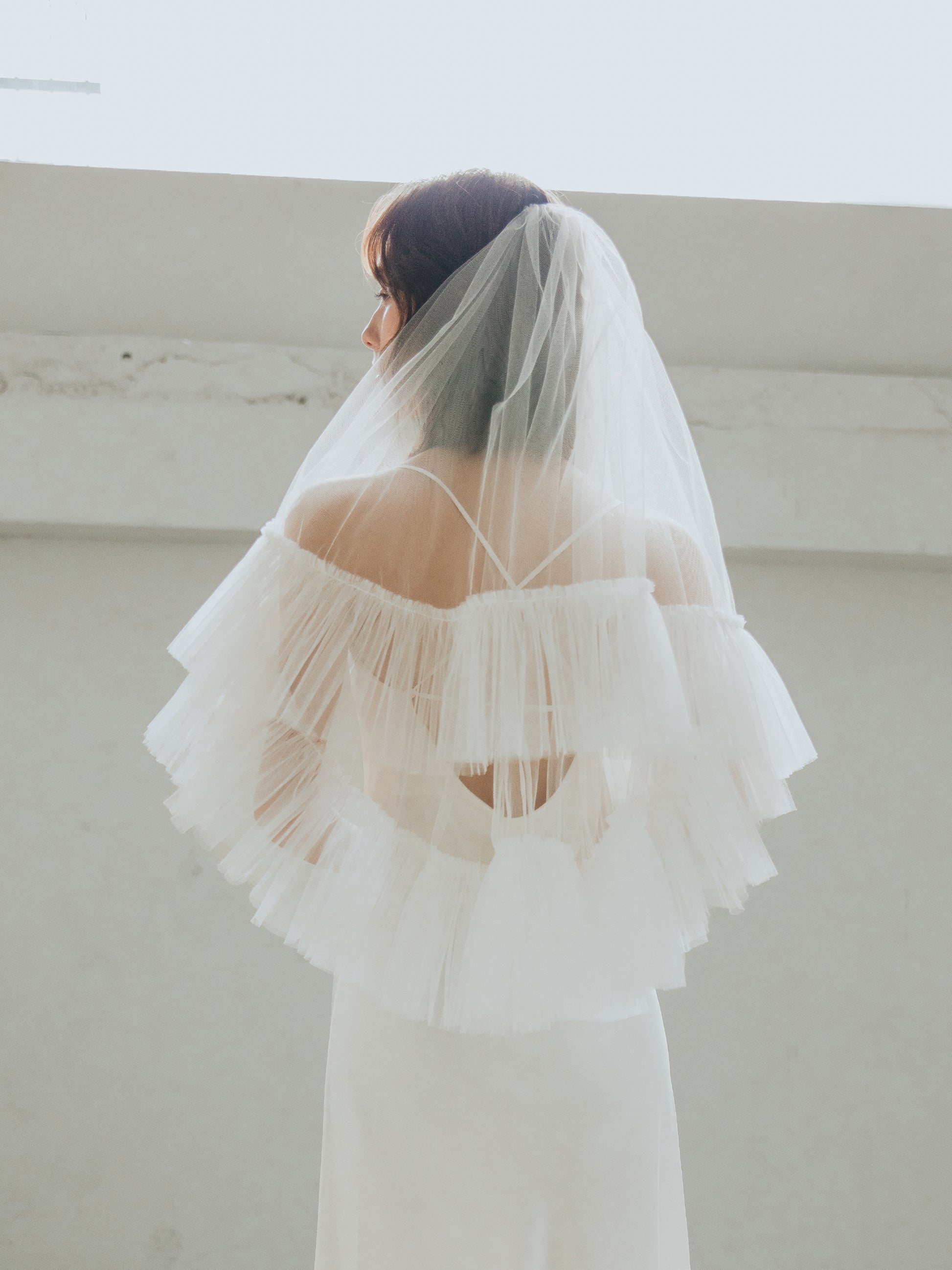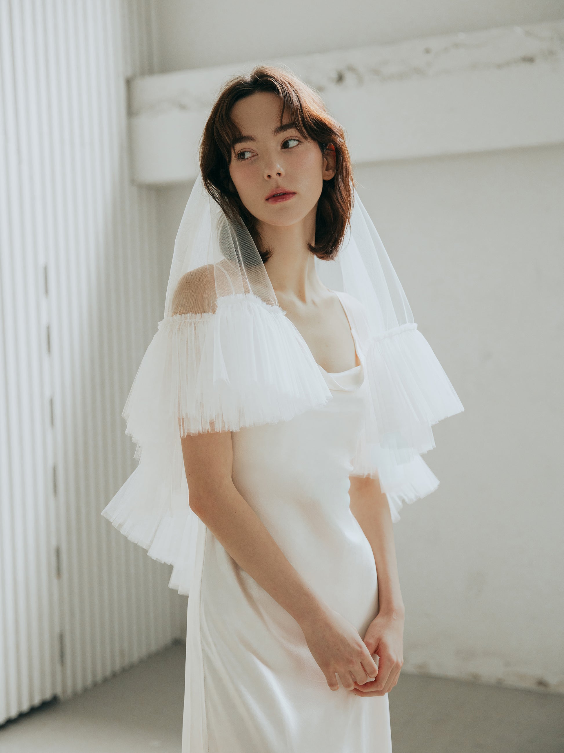 This ethereal bridal veil is made with cascading layers of soft, pleated tulle, giving it a beautiful balance of flow and structure. The delicate ruffle edges and gentle blusher frills add a romantic, airy feel. It’s the perfect finishing touch for a dreamy, modern bridal look.