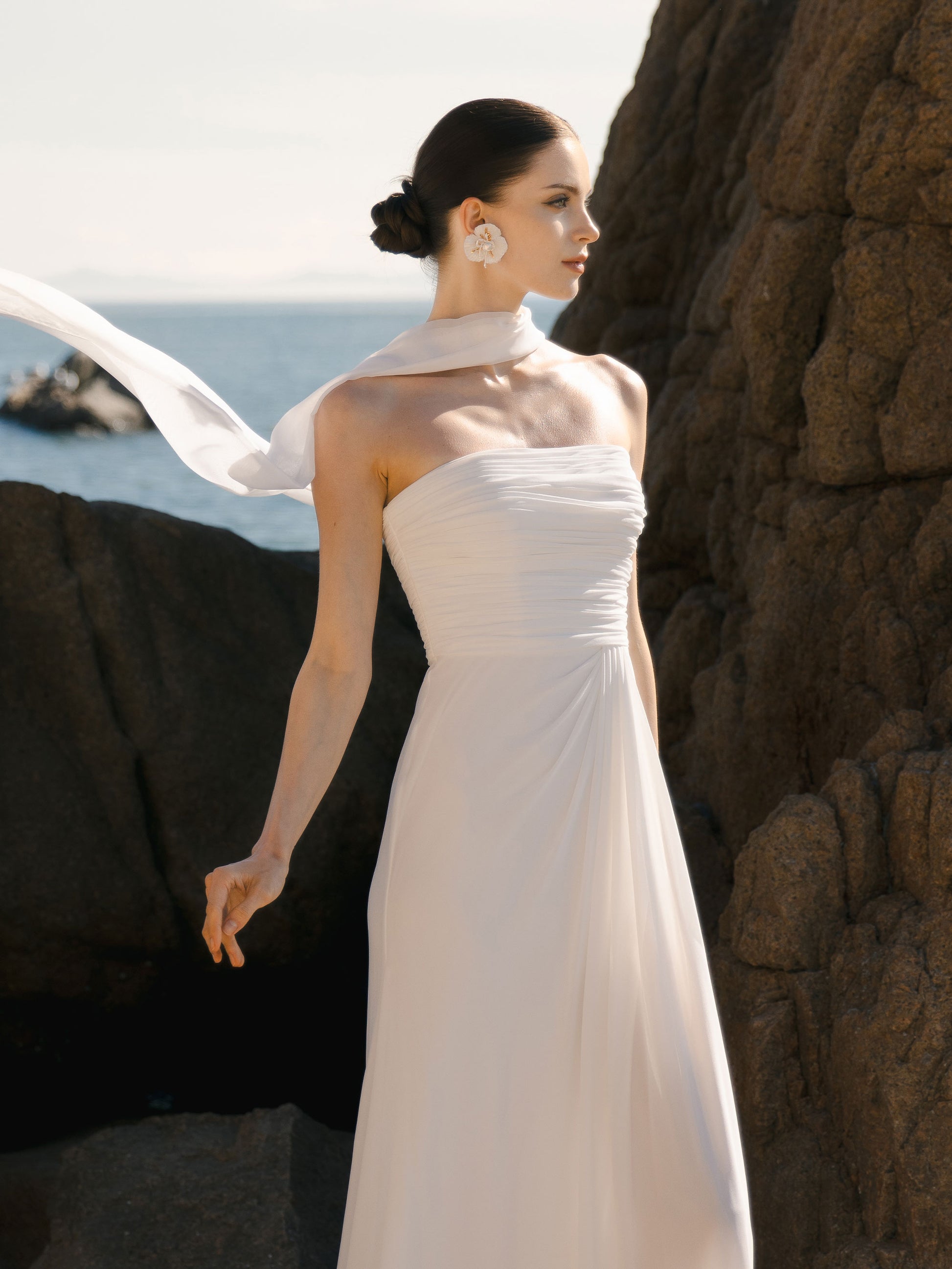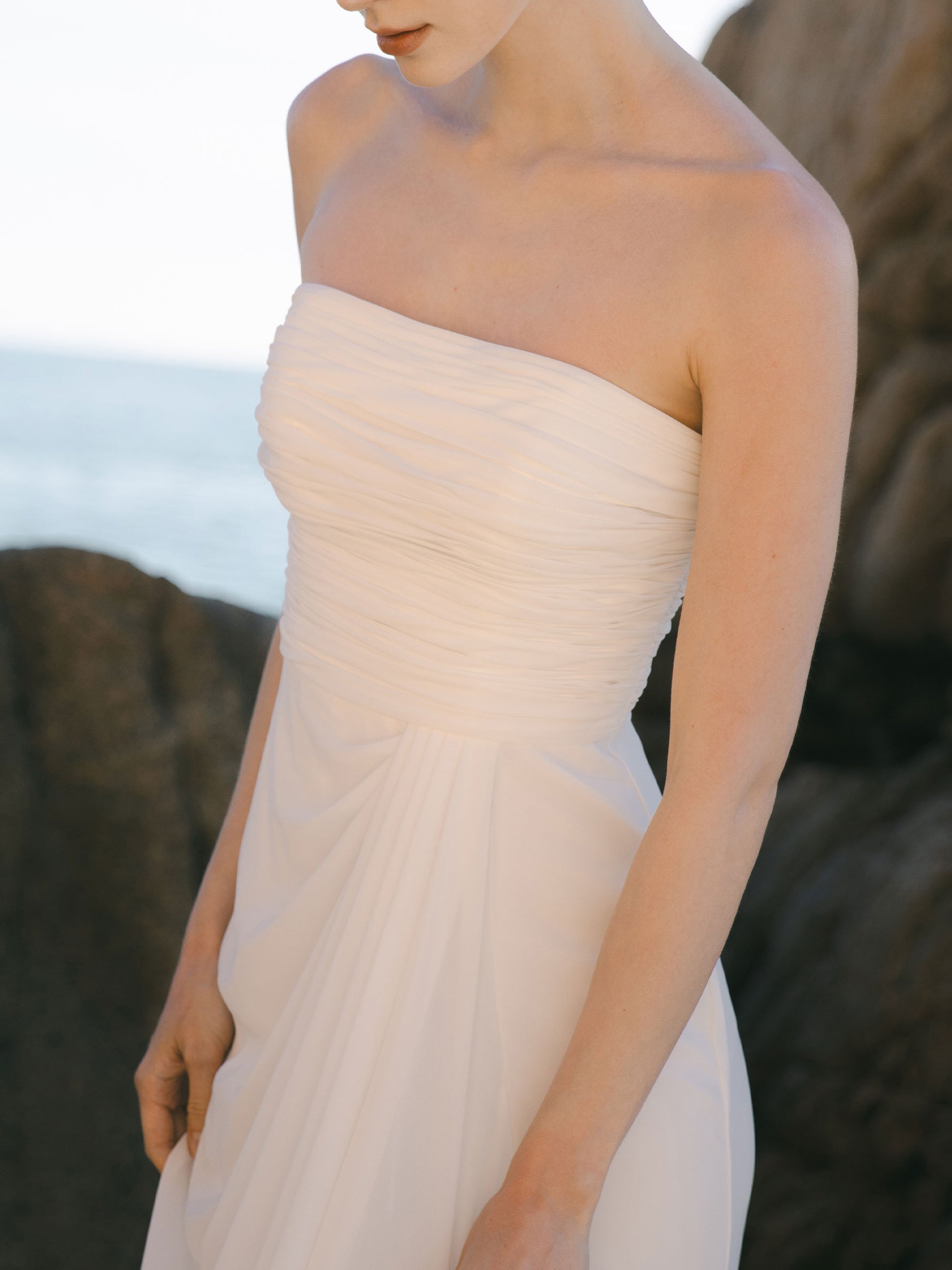 This dress is simple, modern, and elegant. The soft, flowing fabric drapes naturally over the body, and the gently ruched bodice gives just the right amount of shape without feeling tight or structured. There’s also a soft side slit along the leg. It stays hidden when you’re standing, but shows just a hint of leg as you move.