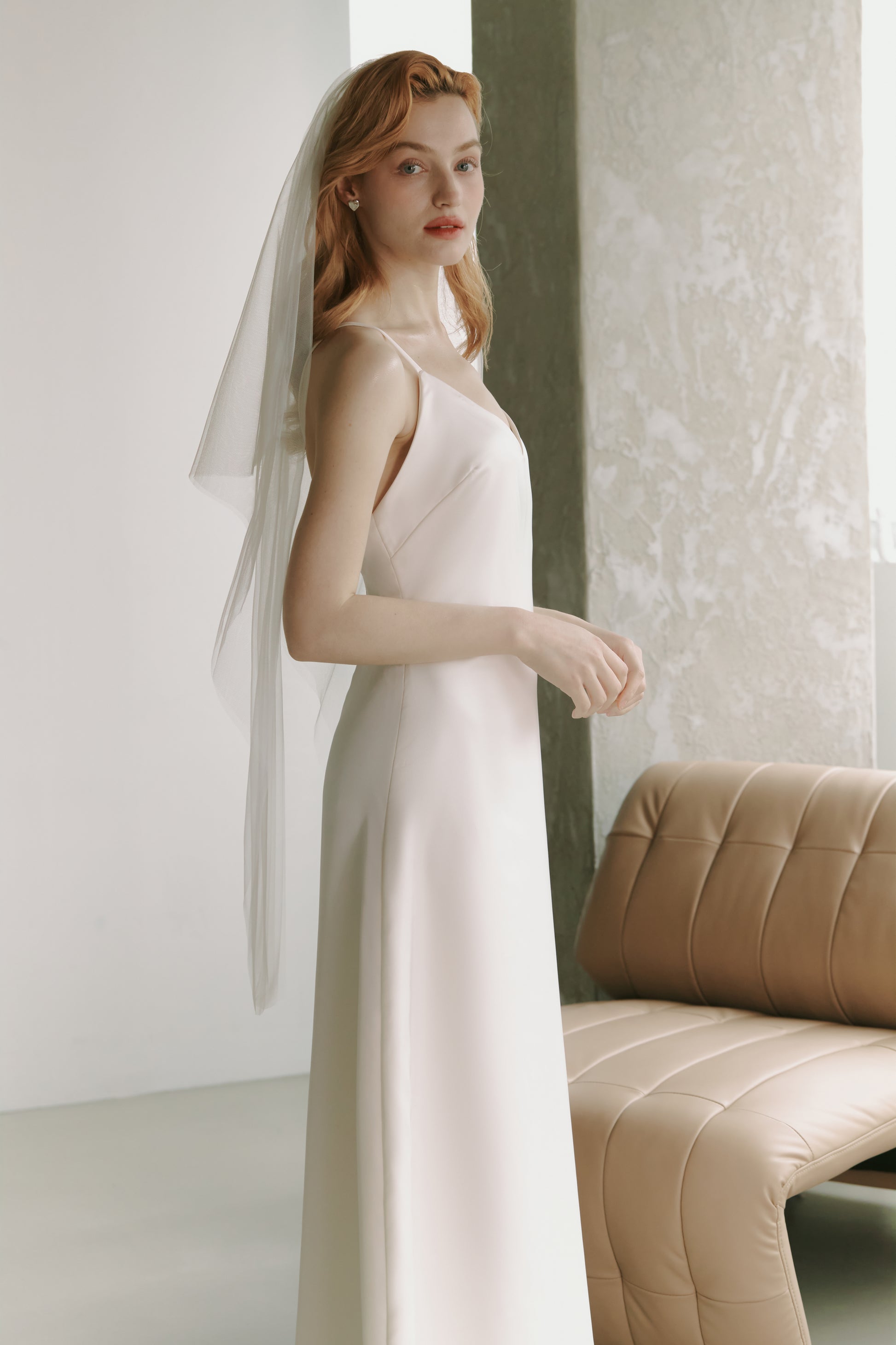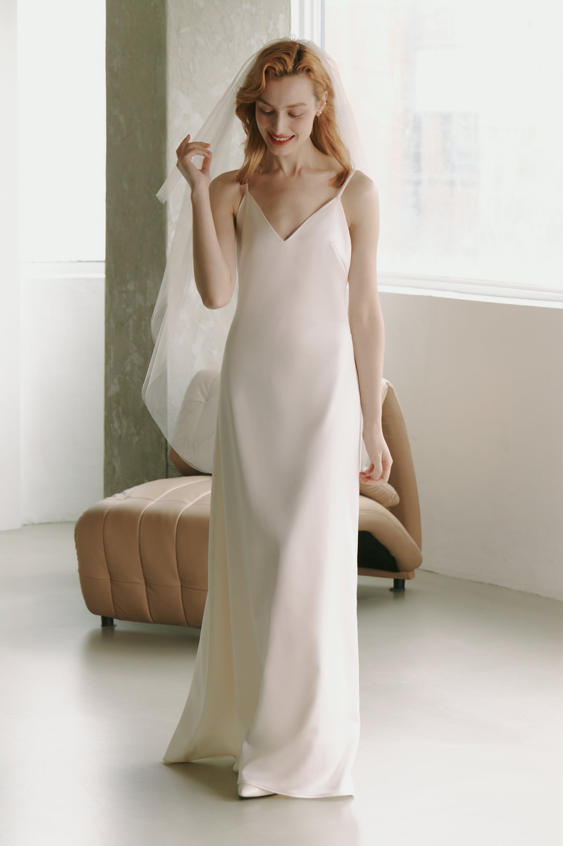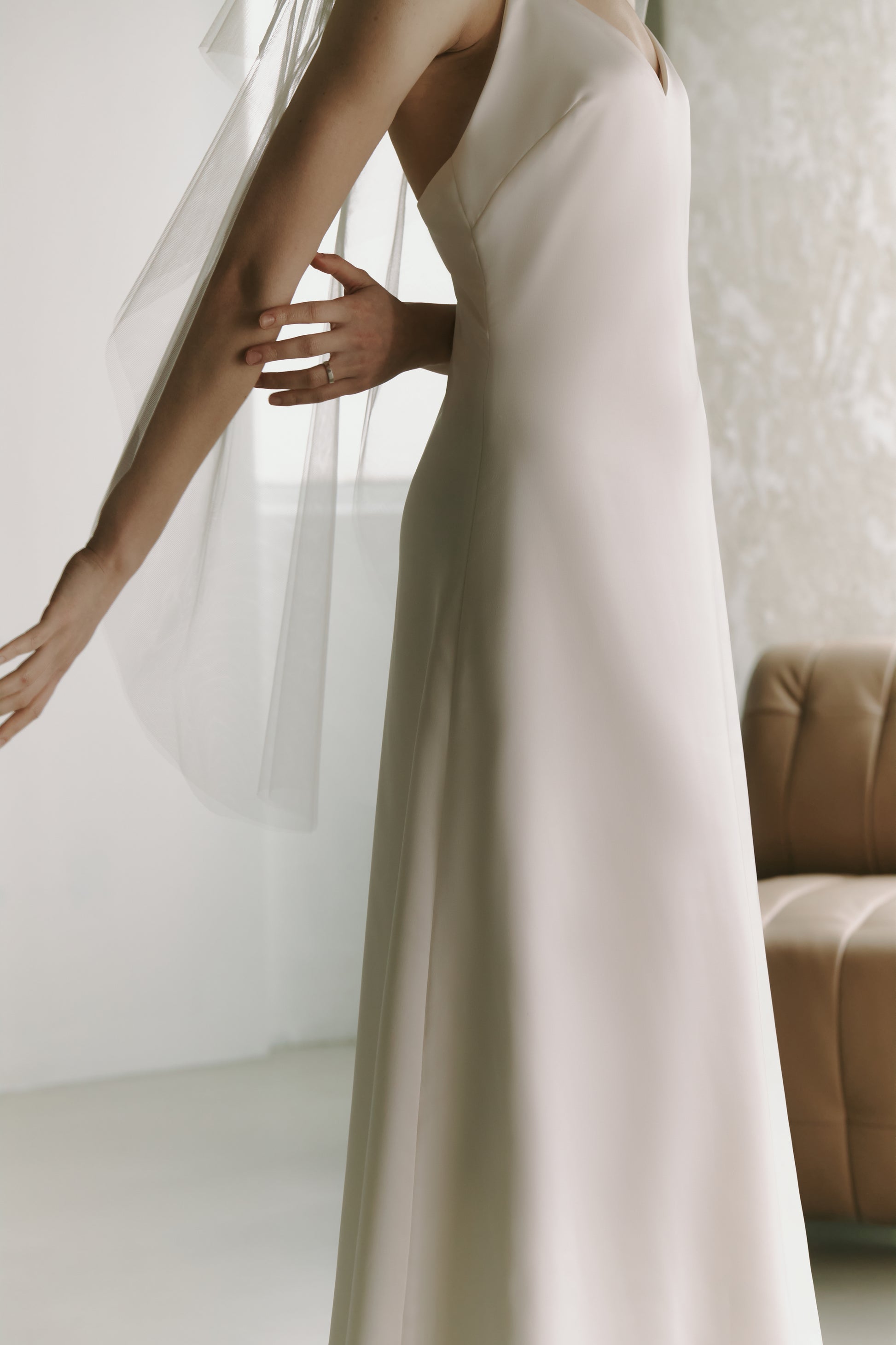 Made from luxurious silky satin, this gown has a clean and modest style. The smooth fabric drapes nicely, and the modest design adds a timeless touch of sophistication. Ideal for brides who appreciate classic beauty and simplicity, this dress is sure to shine on your special day.