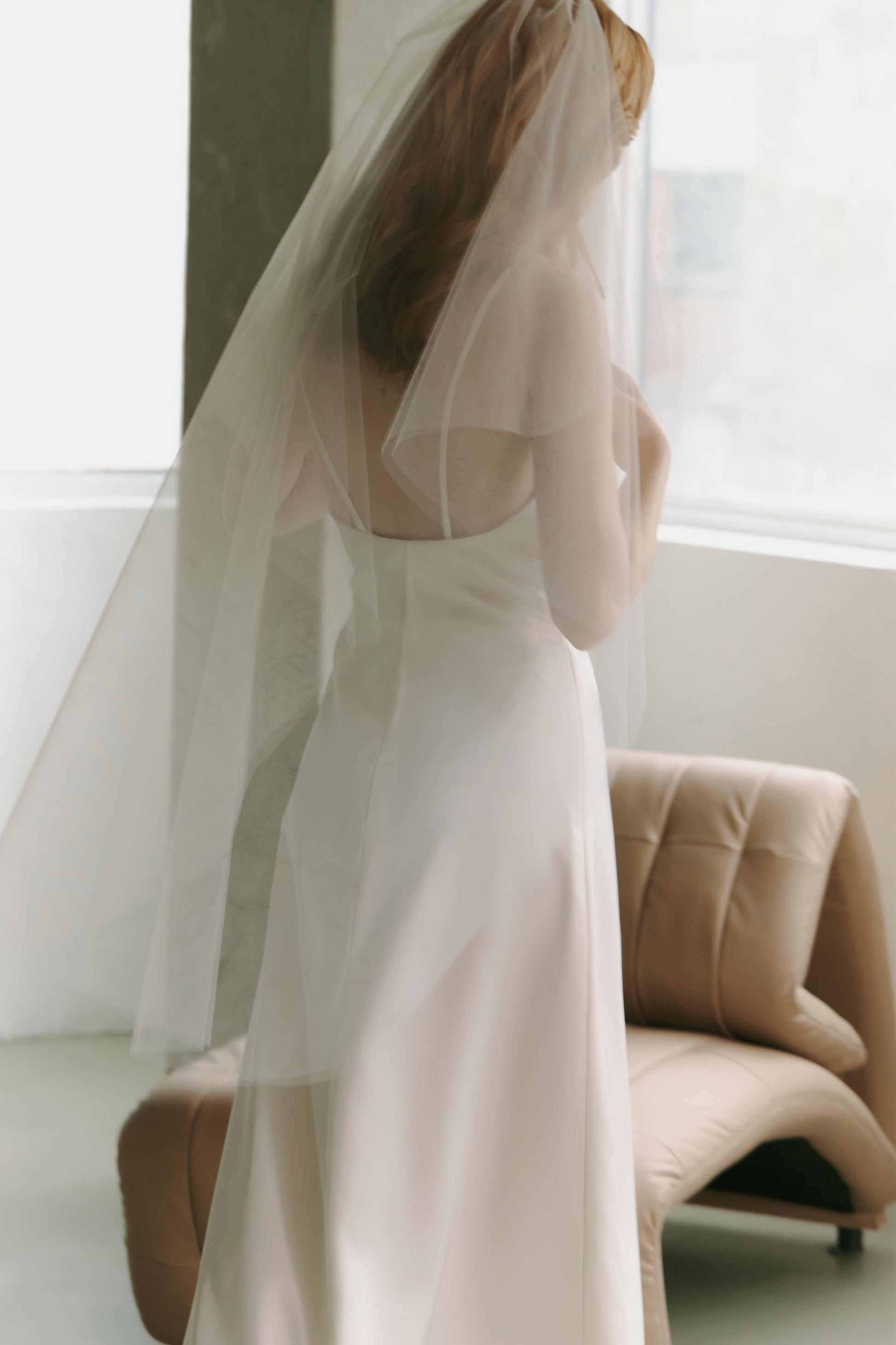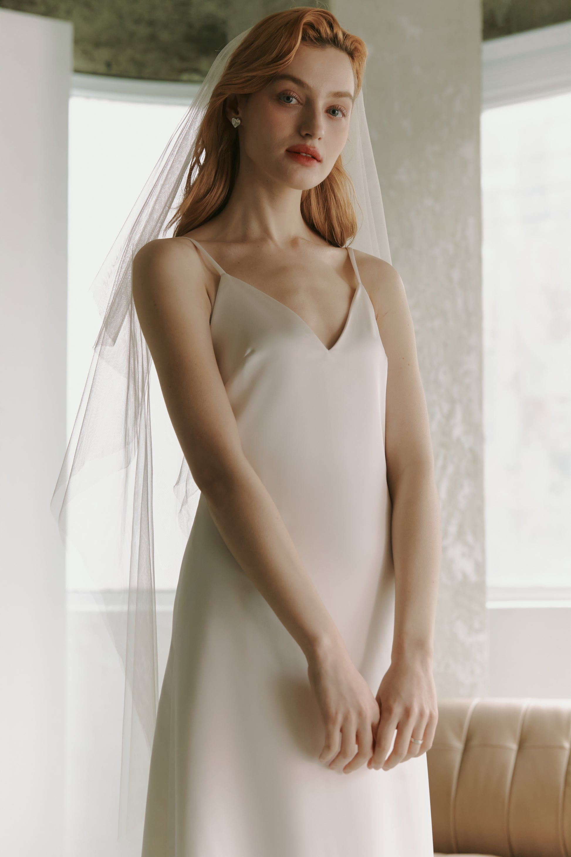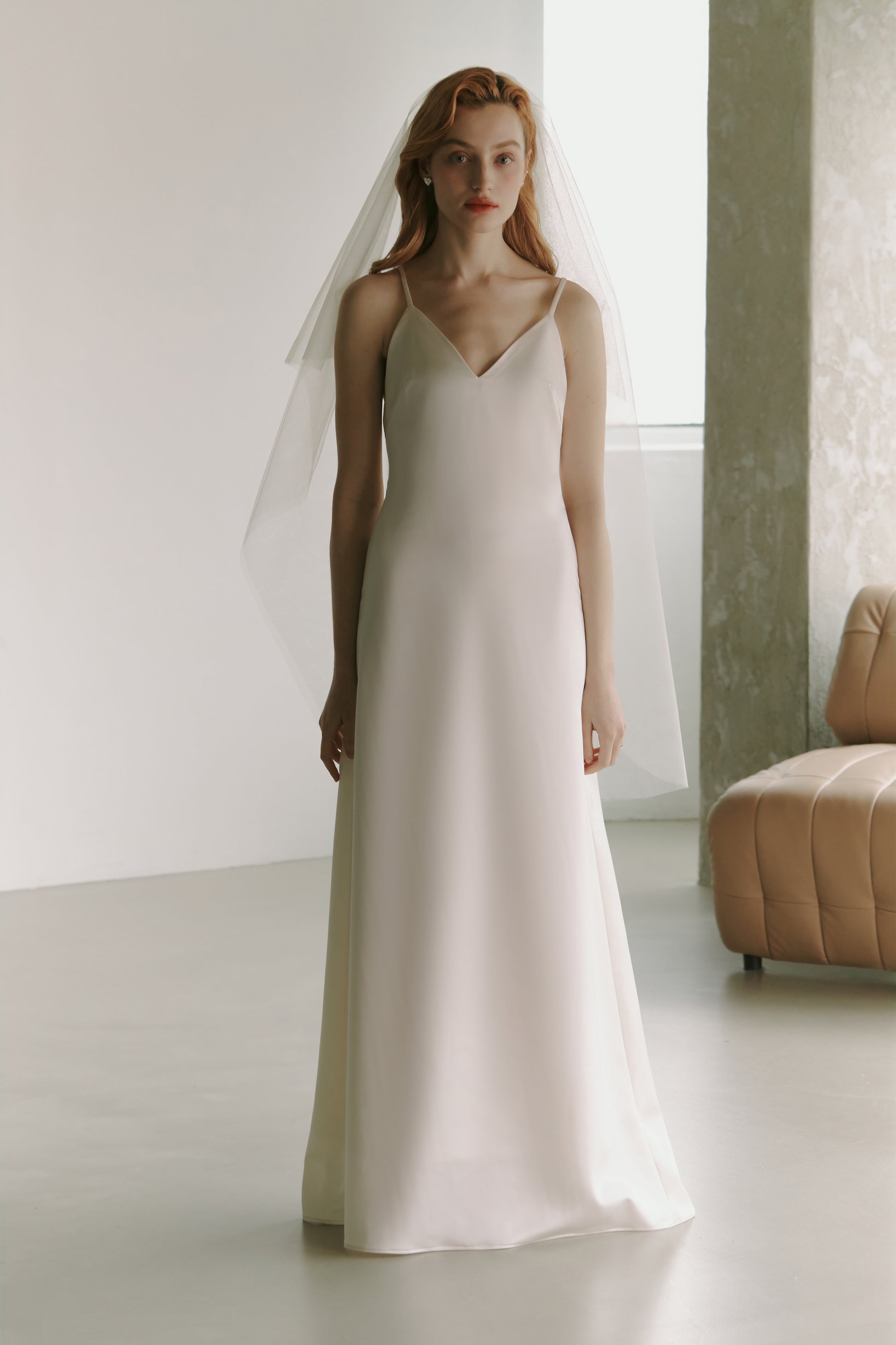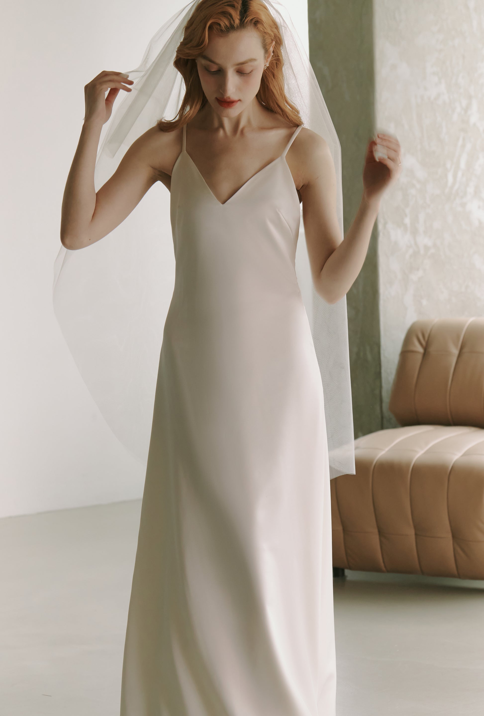 Made from luxurious silky satin, this gown has a clean and modest style. The smooth fabric drapes nicely, and the modest design adds a timeless touch of sophistication. Ideal for brides who appreciate classic beauty and simplicity, this dress is sure to shine on your special day.